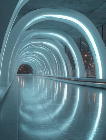 Illuminated arches create a stunning corridor within a modern architectural space, showcasing sleek design and reflective surfaces on a quiet night.