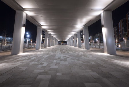 This image features a long, columned walkway under an elevated structure, captured with a symmetrical perspective. The scene is illuminated by atmospheric lighting, creating a play of light and shadow. The composition highlights geometric patterns and textures. Suitable for illustrating urban design or architectural concepts in a variety of visual projects.