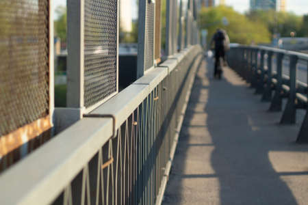 Bridge over the highway. Pedestrian road along the machine bridge. Automobile bridge. The road is separated from the cars by a bump stop.