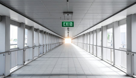 A long, modern corridor stretches into a bright, hopeful light, guided by a glowing green exit sign.