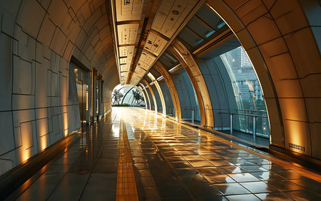 This image showcases a modern enclosed pedestrian bridge, featuring a symmetrical composition. The structure uses wood and glass. The lighting is bright and even, casting soft reflections. The design could be suitable for architecture, transportation or urban environment illustration.