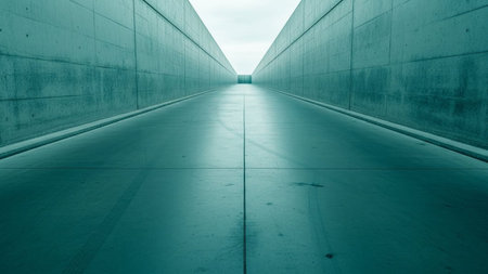 captures a long, straight concrete tunnel or corridor, characterized by its stark, minimalist and strong sense of perspective. The smooth, grey-blue concrete walls converge towards a distant vanishing point, creating a powerful visual pull. The floor is also concrete, reflecting faint light and showing subtle tire marks. The overall atmosphere is futuristic, sterile, and slightly unsettling, evoking a sense of endless passage.