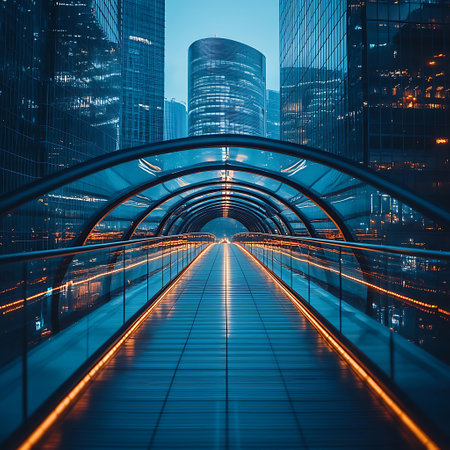A stunning futuristic walkway showcased against a vibrant urban skyline. The serene atmosphere at dusk highlights the harmonious blend of architecture and technology.