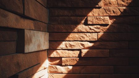 A beautiful close-up of a textured stone wall illuminated by natural light, creating intriguing shadows that enhance the warm tones, ideal for interior aesthetics.