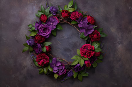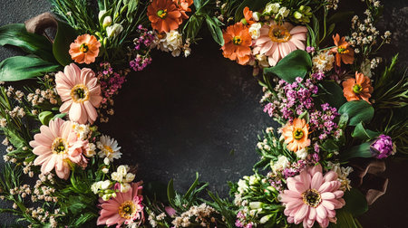 A vibrant floral wreath composed of colorful flowers arranged in a circular design, set against a dark background, perfect for decoration and celebration themes.