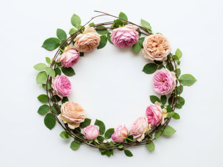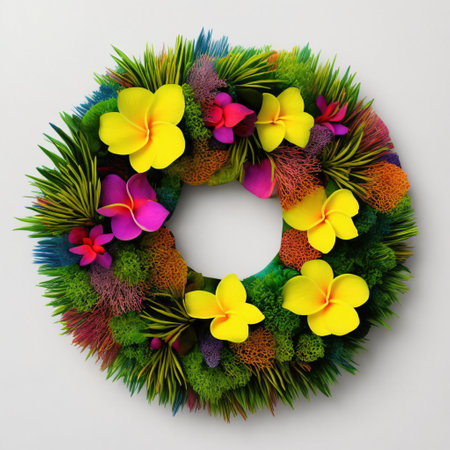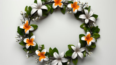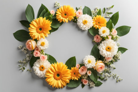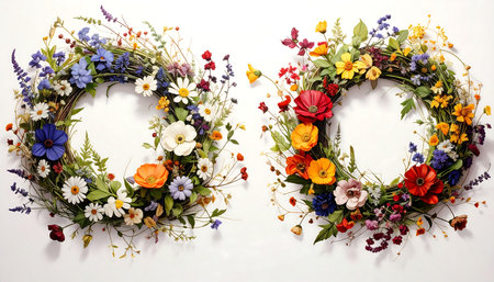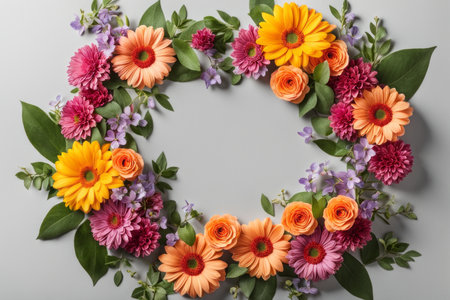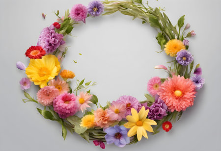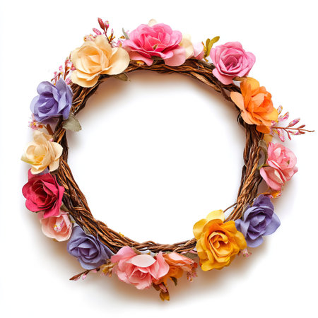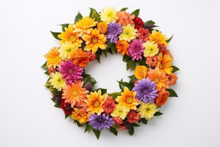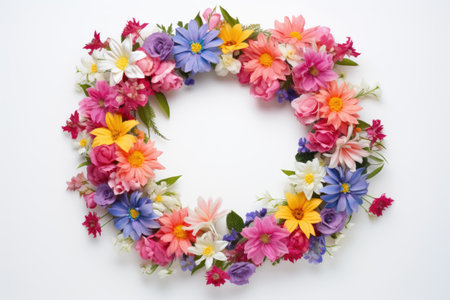 Stunning floral wreath made of vibrant flowers arranged on a white background. Perfect for spring or summer themes, celebration, or decoration.