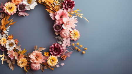 A top view of a wreath made of spring flowers on a pastel background, with space for text.