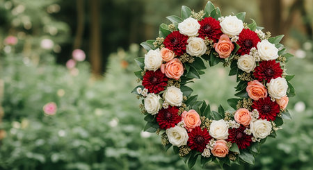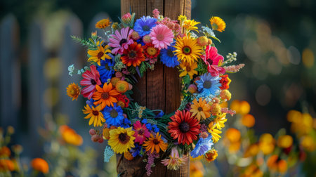 Colorful flowers form a round wreath, showcasing hues of red, pink, and yellow in a sunlit garden setting