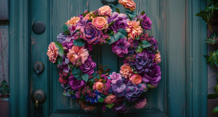 A vibrant floral wreath with purple, pink, and peach blooms hangs on a teal door with brass hardware.