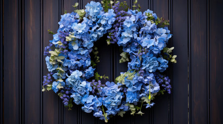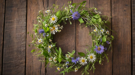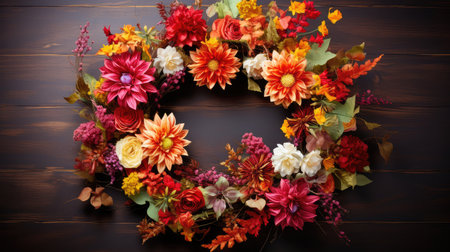 Generative AI Image of Flowers Wreath Circle Frame with Copy Space on Wooden Wall Background