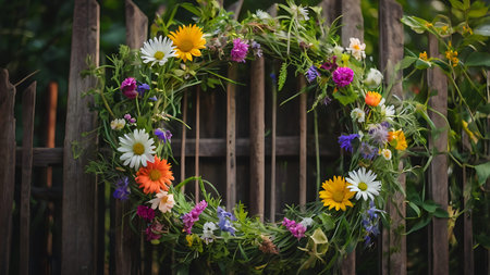 a colorful flower wreath atop a wooden pole symbolizes the height of summer at the solstice celebration