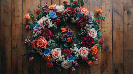 A stunning floral wreath arrangement bursts with color, featuring vibrant roses, daisies, and other beautiful blooms. This captivating display rests gracefully on a rustic blue wooden table, illuminated by warm sunlight. Captured from a top-view perspective, the image offers a natural and fresh aesthetic, perfect for spring and summer-themed projects. Ideal for wedding invitations, greeting cards, or design elements, this botanical garland evokes elegance and celebrates the beauty of nature.