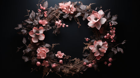Generative AI, Close up wreath, blooming flowerbeds of amazing pink flowers on dark moody floral textured background.