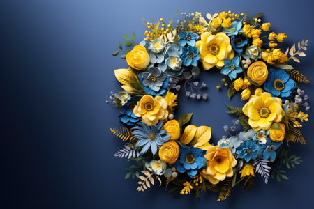 Generative AI, Wreath of blue and yellow flowers with copy space, natural organic floral frame, Ukrainian flag colors