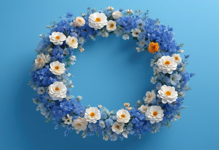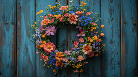 A colorful flower wreath with a blue background. The flowers are arranged in a circle and are of various colors. The wreath is a beautiful and vibrant decoration that adds a touch of nature