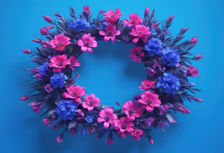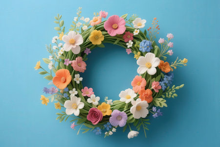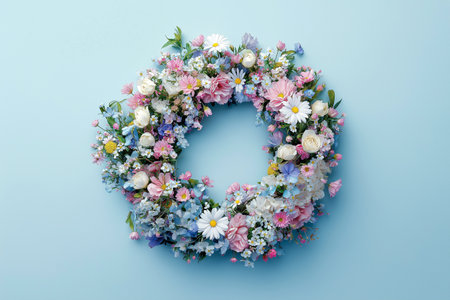 Colorful floral wreath on pastel blue background symbolizing spring and celebrations, bright flower circle design with vibrant pink, blue, and green against soft blue.