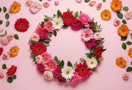 Top view of Blooming colorful wreath flowers and petals isolated on pastel table background, Floral frame composition, copy space, flat lay.