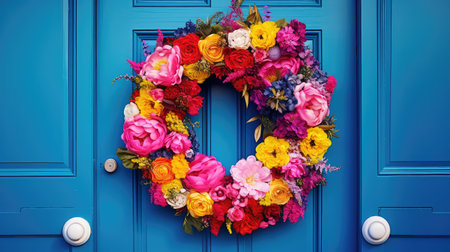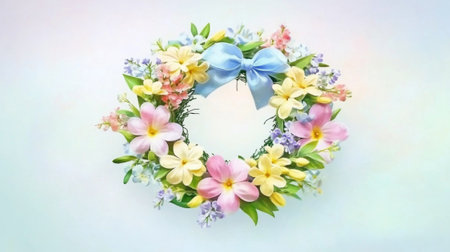Colorful spring flowers form a beautiful wreath featuring pastel tones and a blue ribbon. This elegant decoration celebrates the warmth and renewal of the spring season, adding joy to any setting.