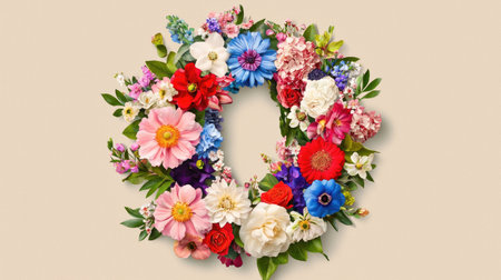 Captivating floral wreath featuring an array of colorful flowers on a soft beige background, perfect for seasonal decor or charming aesthetic displays.