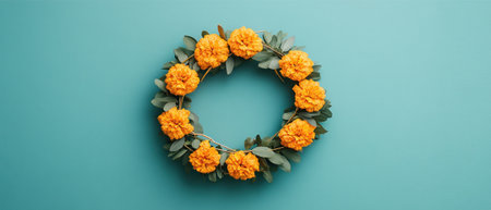 Bright marigold flower wreath on a vibrant blue background, perfect for decoration or celebration.