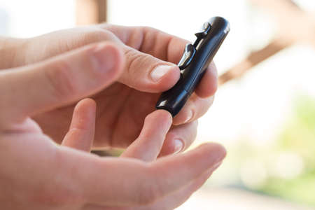 Closeup of man hands using lancet on finger to check blood sugar level by Glucose meter. Use as Medicine, diabetes, glycemia, health care and people concept.