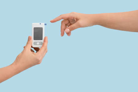 Female hands with glucometer on color background. Diabetes concept
