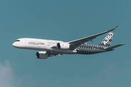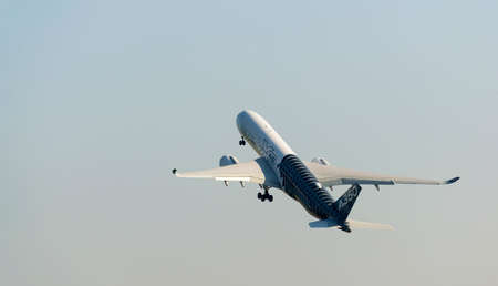 Zhukovsky, moskow region, Russia - August 31, 2019: Airbus Industrie A350 modern civil airliner taking off for a demo flight in Zhukovsky during MAKS-2019 airshow.
