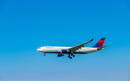 Zurich, Switzerland - July 19, 2018: Delta airlines airplane preparing for landing at day time in Zurich international airport