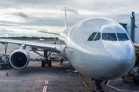 Modern airplane stands at the airfield of international airport, workers standing beside, people's faces are unrecognizable