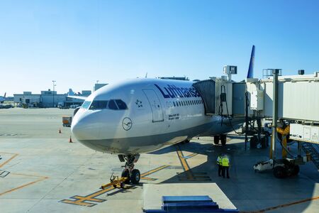 Frankfurt am Mine, Germany - November 28, 2019: Aircraft standing near the terminal