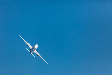 Large commercial airplane making a turn; blue sky background
