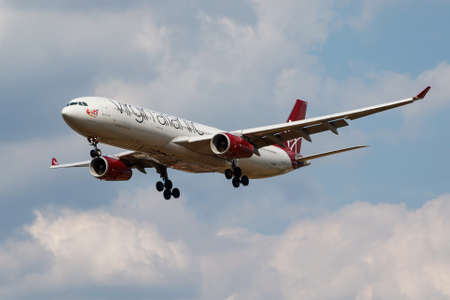 LONDON / UNITED KINGDOM - JULY 14, 2018: Virgin Atlantic Airbus A330-300 G-VGEM passenger plane landing at London Heathrow Airport