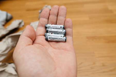 Paris, France - Jan 23, 2021: POV male hand holding new package of batteries LR03 AAA manufactured for UK Supermarkets in France - piles alcalines