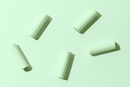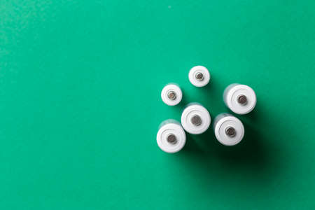 white batteries on a green background, top view. space for text