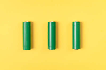 Green AA batteries isolated on green background, energy concept