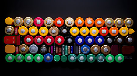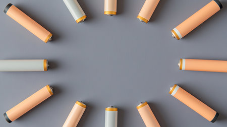 A creative layout of colorful battery cylinders arranged in a circular pattern on a soft gray background, ideal for energy-themed projects and designs.