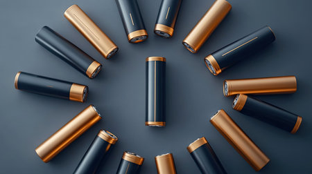 A striking arrangement of sleek battery cylinders in black and copper tones, perfect for showcasing modern energy solutions in a professional and artistic manner.