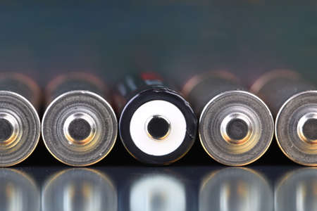 Batteries arranged side by side, on a dark surface. Batteries, energy and respect for the environment. Alkaline or rechargeable batteries.