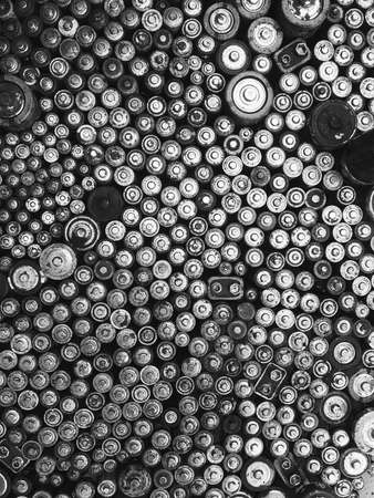 Old used batteries group. Top view background texture wallpaper. Black and white photography