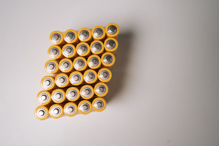 Top view of cylindrical aa batteries symmetrically positioned, forming geometric arrangement against isolated white background, emphasizing battery collection precise organizational design, no people