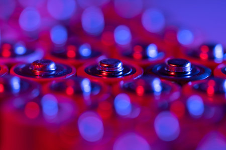 Energy, abstract colorful background. Top view of round, alkaline batteries. Several batteries are next to each other, standing on a colored background.