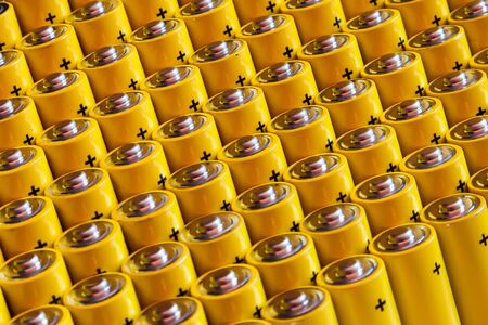 Alkaline battery aa size. Several batteries in rows.A close-up of the same yellow batteries, lined up in even rows by positive charges. An unsafe way to use energy.