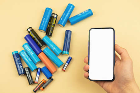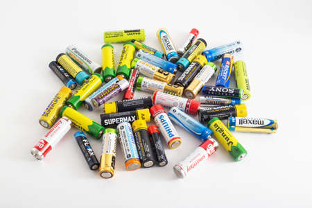 Kiev. Ukraine. December. 2021. Used batteries from different manufacturers, waste, collection and recycling, high danger for the environment.