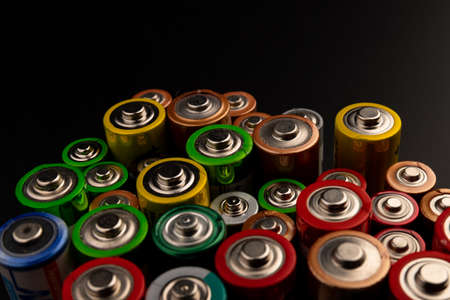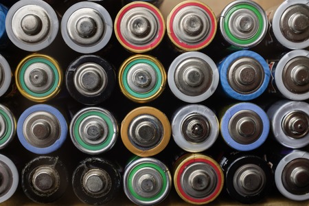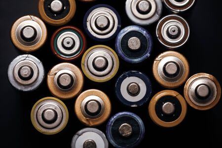 Used batteries-danger to the environment Horizontal shot. Multicolored used electric batteries view from above.