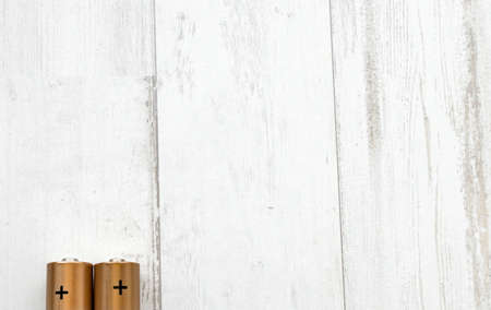 Alkaline batteries on white wooden background