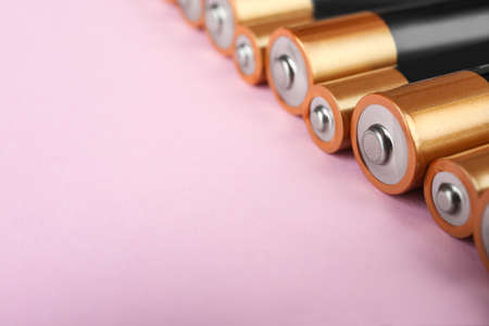 Alkaline batteries on pink background, closeup