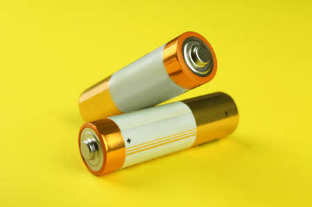 Two new AA batteries on yellow background, closeup