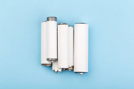 AA batteries are arranged in the form of a large battery on a blue background. Top view. The concept of energy supply and utilization