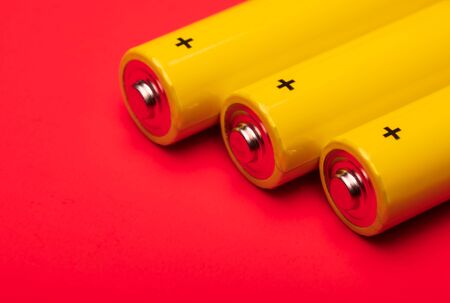 Close up shot of yellow AA alkaline or rechargeable NiMH batteries on red background, shallow focus