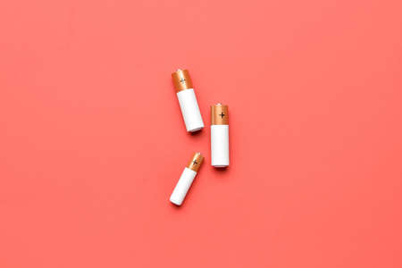 Alkaline batteries on red background, top view